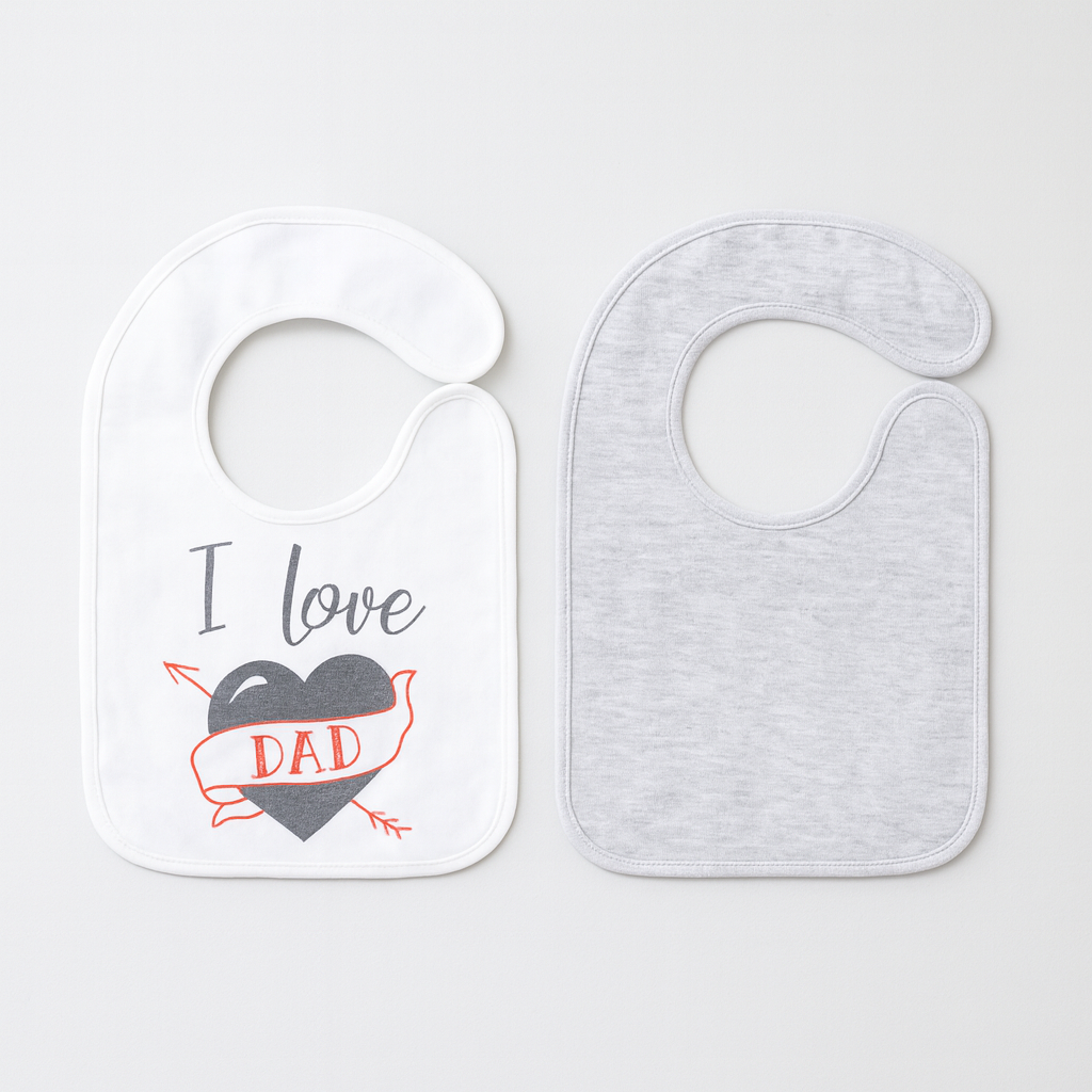 Lot de deux bavoirs naissance de la collection Fête des pères : 1 bavoir blanc à message "I Love Dad" et un bavoir uni gris.